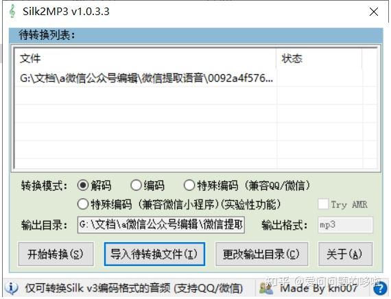 打开silk2mp3软件(需要的话可私聊),将该silk文件进行导入,转化为mp3后缀文件,并且成功播放。